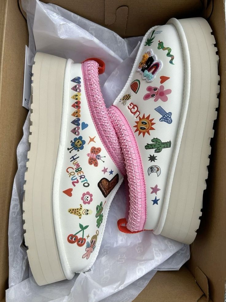Uggs Shoes, Tasman Uggs Colors, Clog Patches Ideas, Patches On Uggs, Pink And Yellow Tasman Uggs, Ugg Tasman Graffiti, Clogs With Patches